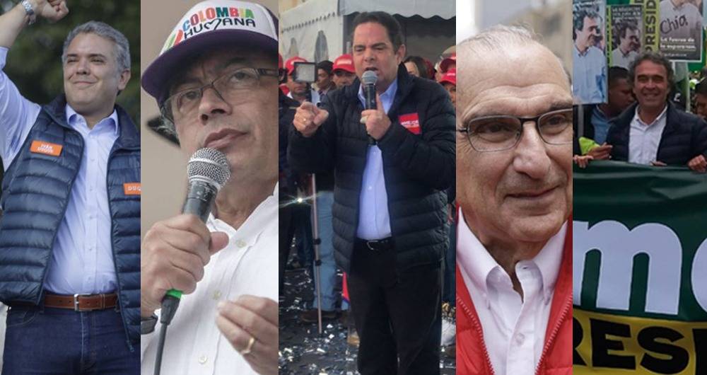 Iván Duque, líder das pesquisas, terminou sua campanha após passar por 23 departamentos, com um discurso se centrou na questão da Venezuela, em fortes críticas ao Acordo de Paz com as FARC e na confiança dos investidores. Sergio Fajardo passou por 17 departamentos, onde falou de educação e da luta contra a corrupção, se dirigiu a um eleitorado jovem em universidades, enquanto Germán Vargas Lleras passou por 20 departamentos, em eventos onde tentou ressaltar sua experiência como gestor, como ministro da Habitação, como vice-presidente e como um homem longe dos extremos da esquerda e da direita. Finalmente, Humberto de la Calle visitou 13 departamentos, mas em vez de lotar praças e repetir discursos, optou por se sentar cara a cara com eleitores, tomar um café ou um refresco, gerar conversas, escutar inquietudes e insistir na importância da educação, o desenvolvimento rural e a paz.