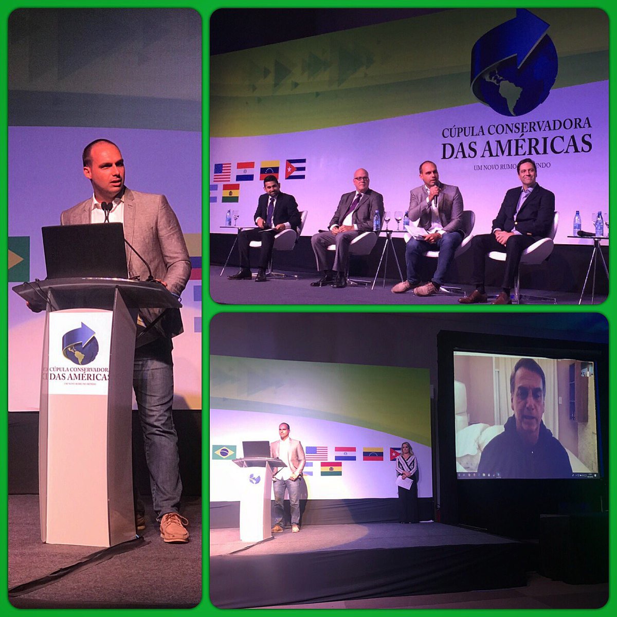 Eduardo Bolsonaro ya venía manteniendo con Bannon, con representantes de la bancada del ex presidente colombiano Álvaro Uribe y con John Bolton, Consejero de Seguridad Nacional de los EEUU, En Foz declaró que Brasil “podría ser sede de un tribunal para juzgar las dictaduras comunistas de Cuba, Venezuela y Nicaragua”, apoyando de esta manera una idea del opositor cubano, residente en Miami, Orlando Gutiérrez, también asistente a la cumbre.
