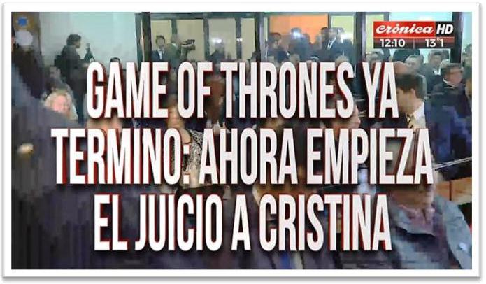 Sobre la imagen del arranque del juicio por la “causa Vialidad» en la sala AMIA de los tribunales federales de Comodoro Py 2002, la señal creada por Héctor Ricardo García estampó el anuncio “Game of Thrones ya terminó: ahora empieza el juicio a Cristina”.