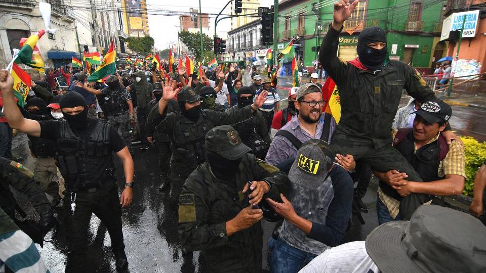 El cuadro político también está tenso e incierto. Los golpistas enfrentan un proceso creciente de movilización nacional atravesado cada vez más por el clivaje racial, ya que reconocen en la autoproclamada presidenta Jeanine Añez, el paramilitar Fernando Camacho, e incluso al perdedor Carlos Mesa, dirigentes contrarios a las naciones indígenas, por su historia y el atropello a la bandera whipala.