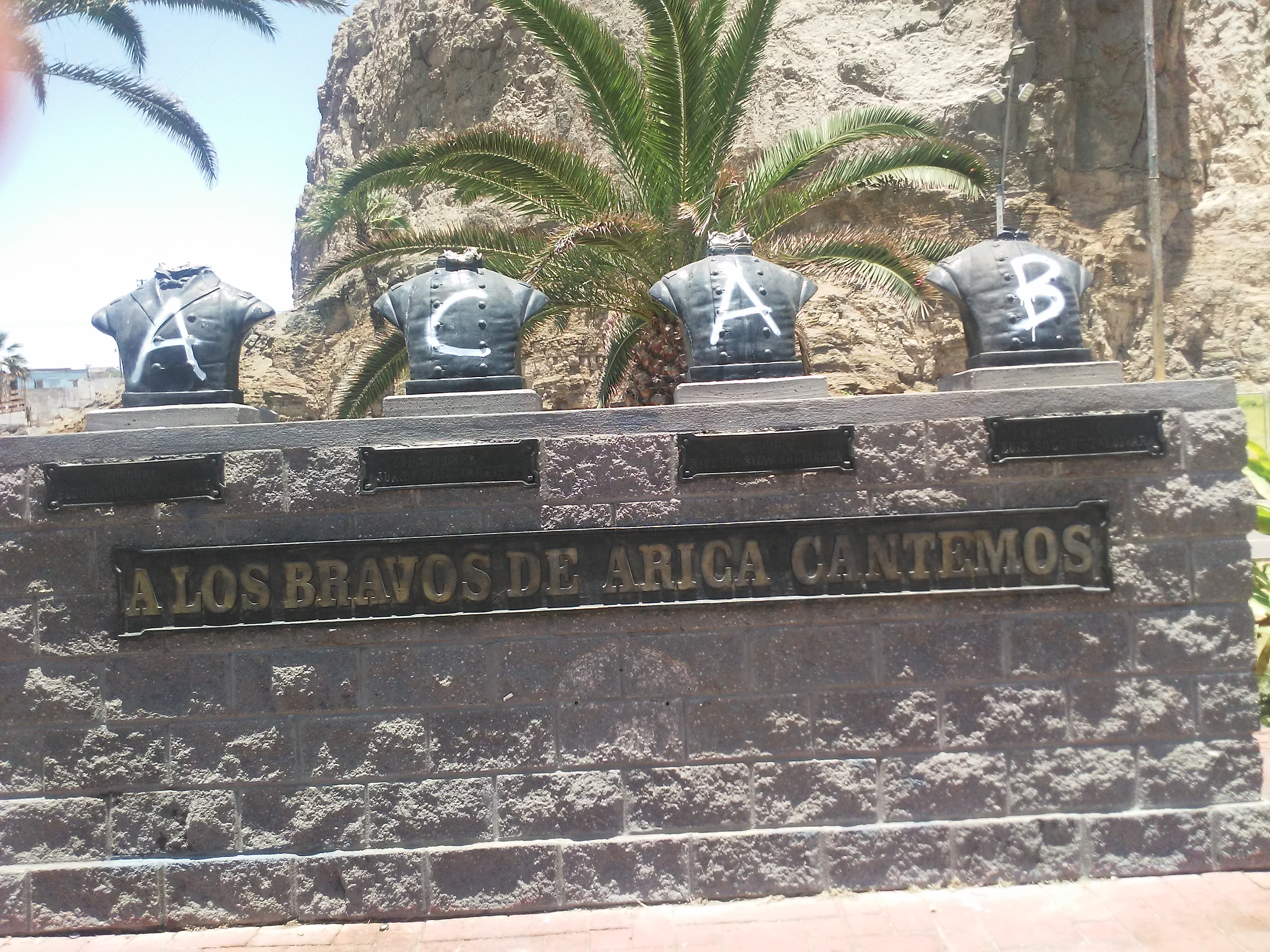 l Morro de Arica, acompañados por una gran placa metálica que lleva la siguiente inscripción como homenaje a su memoria: “A los bravos de Arica cantemos”.