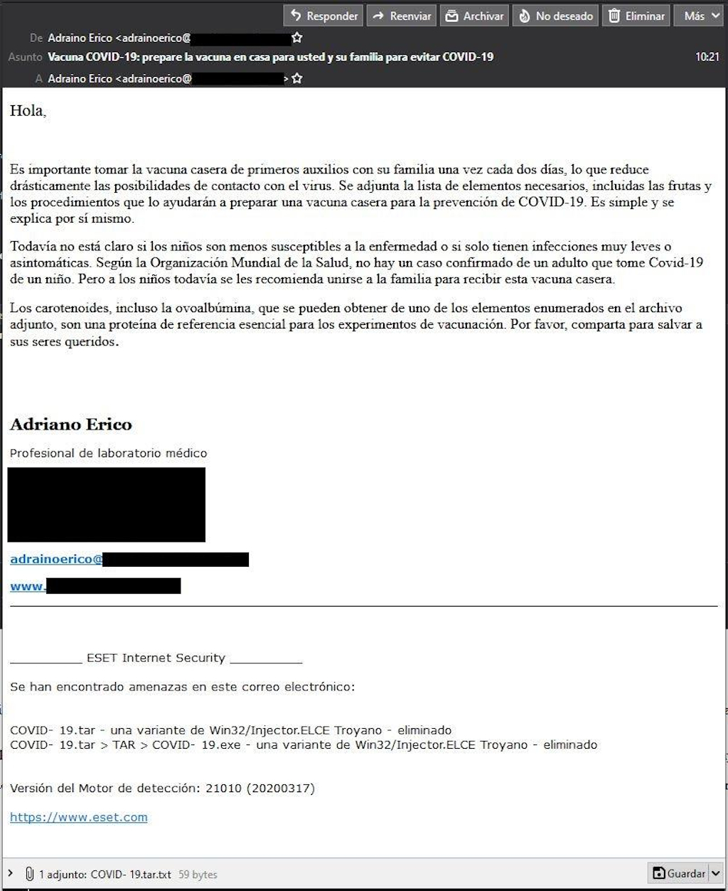También la firma ESET da cuenta de un importante incremento en correos electrónicos con adjuntos maliciosos. Son los que denominamos “correos phishing” en tanto contienen adjuntos que, una vez instalados en el computador de la víctima, ponen en funcionamiento programas que se ocupan de robar datos personales, contraseñas, tarjetas de crédito, entre otra valiosa información personal. En general se han denunciado correos electrónicos donde se proponen curas para el COVID-19.