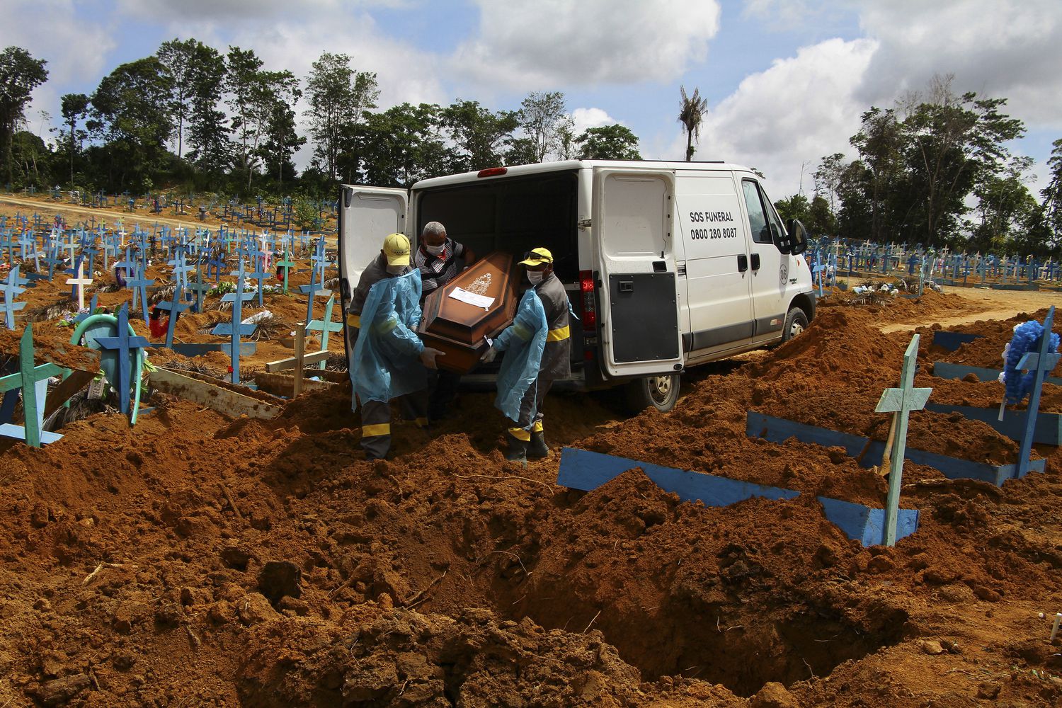 Rio de Janeiro: Cemetery workers in protective clothing maneuver the coffin of 57-year-old Paulo Jose da Silva, who died from the new coronavirus, in Rio de Janeiro, Brazil, Friday, June 5, 2020. According to Monique dos Santos, her stepfather mocked the existence of the virus, didn't use a mask, didn't take care of himself, and wanted to shake hands with everybody. "He didn't believe in it and unfortunately he met this end. It's very sad, but that's the truth," she said. AP/PTI Photo(AP06-06-2020_000006A)