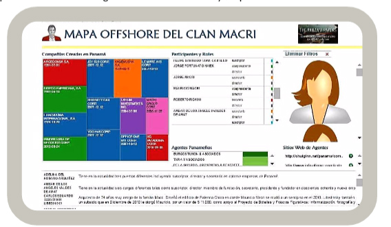 Fuente: Mapa offshore del Clan Macri. Portal El Revelador, de periodismo de datos, administrado por la Licenciada en Informática María Soledad Escobar. http://elrevelador.com.ar/2016/04/16/los-macri-