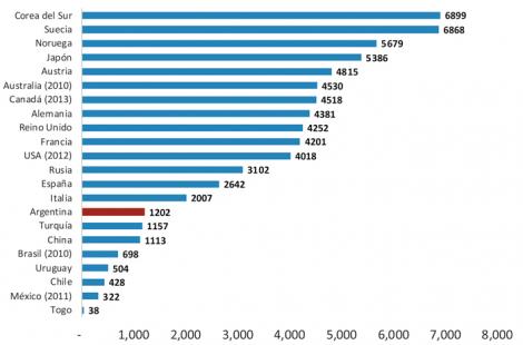 La correlación entre investigadores por millón de habitantes y desarrollo es altísima. En los países desarrollados, tal cifra supera en promedio los 4 mil investigadores por millón de habitantes, siendo Corea del Sur y Suecia los países líderes, con casi 7 mil investigadores por millón de personas en 2014, según el Banco Mundial. Argentina se ubica bien posicionada en América latina, con 1202 investigadores por millón de habitantes, muy por encima de Brasil (en torno a los 700), Uruguay (504), Chile (428) y México (322). Sin embargo, todavía está muy lejos del grueso de los países desarrollados.