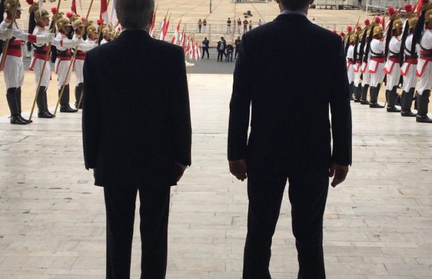 ¿Cuál es entonces la visión que el gobierno argentino, convertido transitoriamente en interlocutor privilegiado para la región ante la debacle de Brasil? En primer lugar, y como ya se ha remarcado, la vuelta a los preceptos del libre comercio. Éstos tendrían en Trump un aparente obstáculo, aunque hasta ahora todo parecería indicar lo contrario. En principio porque las temidas medidas proteccionistas de la actual administración estadounidense aún no se han visto. EEUU, al igual que la Unión Europea, mantiene una política de férrea protección en su sector agrícola desde hace décadas, y los efectos sobre la región no son nuevos. Pero los beneficios para los librecambistas derivan principalmente de la reacción que Trump despertó en el mundo: el libre comercio se convirtió en un valorbr temer y macri de espaldas civilizatorio a defender ante los populismos de todo signo y color, y en los últimos meses la mayoría de los gobiernos del mundo -¡con China a la cabeza!- expresaron su fe en él, favoreciendo de hecho nuevas negociaciones. Es en ese sentido que debe entenderse el interés europeo en la región y las giras de sus representantes, como la reciente visita de Rajoy a Brasil y Uruguay.