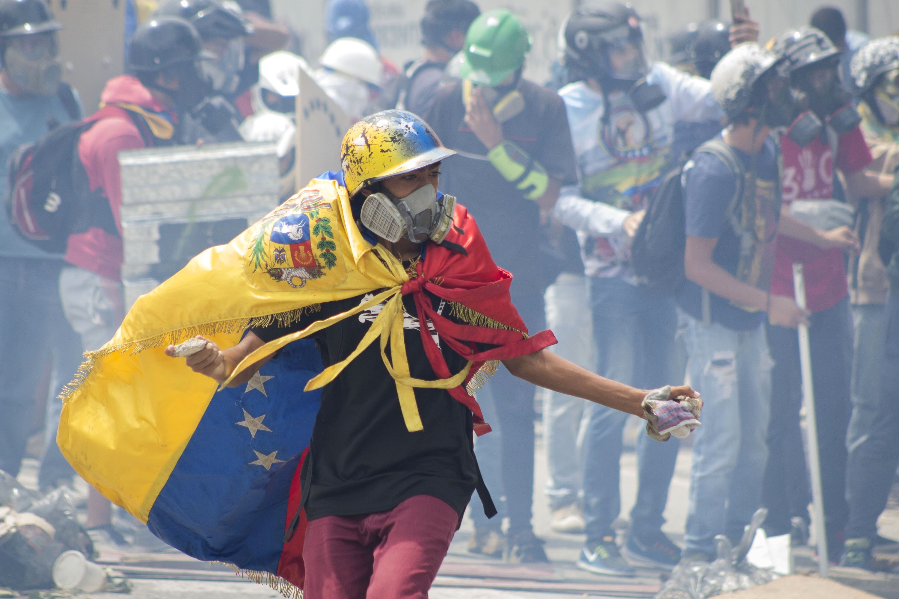 (170722) -- CARACAS, julio 22, 2017 (Xinhua) -- Un manifestante participa durante un enfrentamiento con miembros de las fuerzas de seguridad, en una protesta de opositores al Gobierno venezolano en Caracas, Venezuela, el 22 de julio de 2017. De acuerdo con información de la prensa local, manifestantes intentaron marchar el sábado hacia el Tribunal Supremo de Justicia (TSJ) en apoyo a los magistrados designados el viernes por la Asamblea Nacional (AN), durante una protesta convocada por la Mesa de la Unidad Democrática (MUD). (Xinhua/Str) (bv) (ma) (fnc)