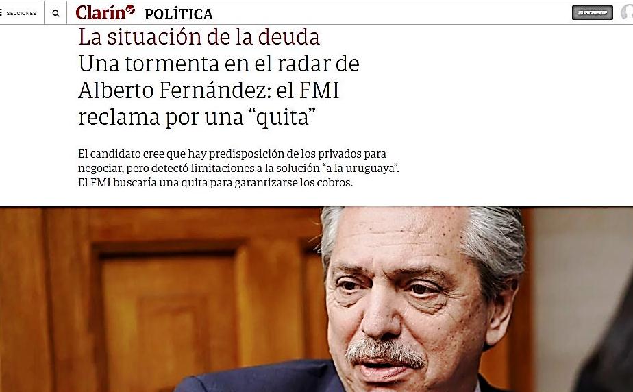Clarín, por caso, se refirió dos veces al tema en cuatro días, la segunda fue el martes primero de octubre, día en que mantuvo en lo más alto de su web el título “Una tormenta en el radar de Alberto Fernández: el FMI reclama por una ´quita´”, con un cintillo en rojo que adelantaba “La situación de la deuda”.