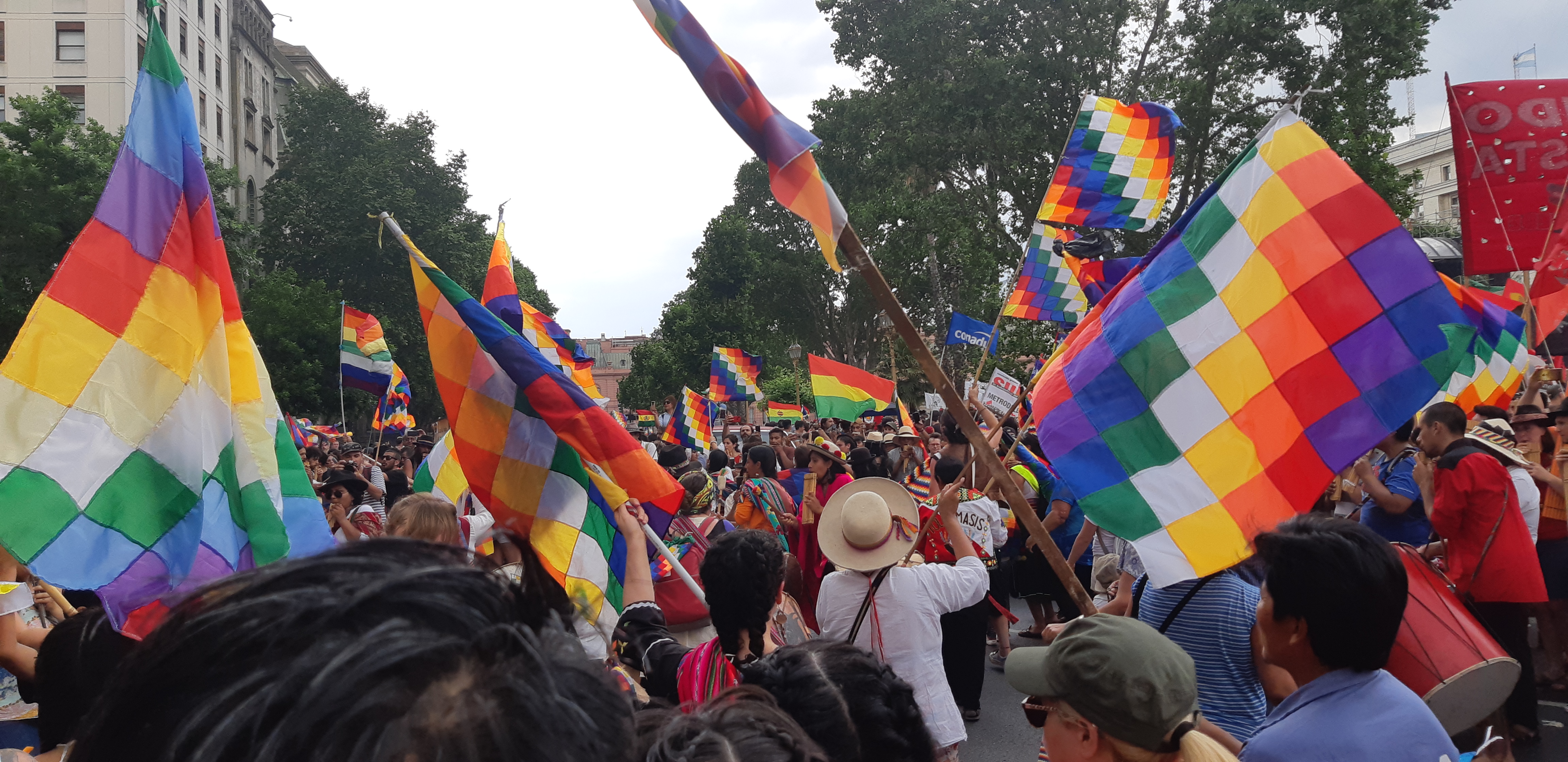 Una Wiphala de 100 metros se abre paso en medio del sol abrasivo de las dos de la tarde del lunes, desde avenida 9 de julio hasta Plaza de Mayo, frente a la sede del gobierno argentino en Buenos Aires. La escoltan las Mujeres de Pollera, símbolo de la lucha y la resistencia del pueblo boliviano. Detrás, miles de bolivianos, argentinos, latinoamericanos.