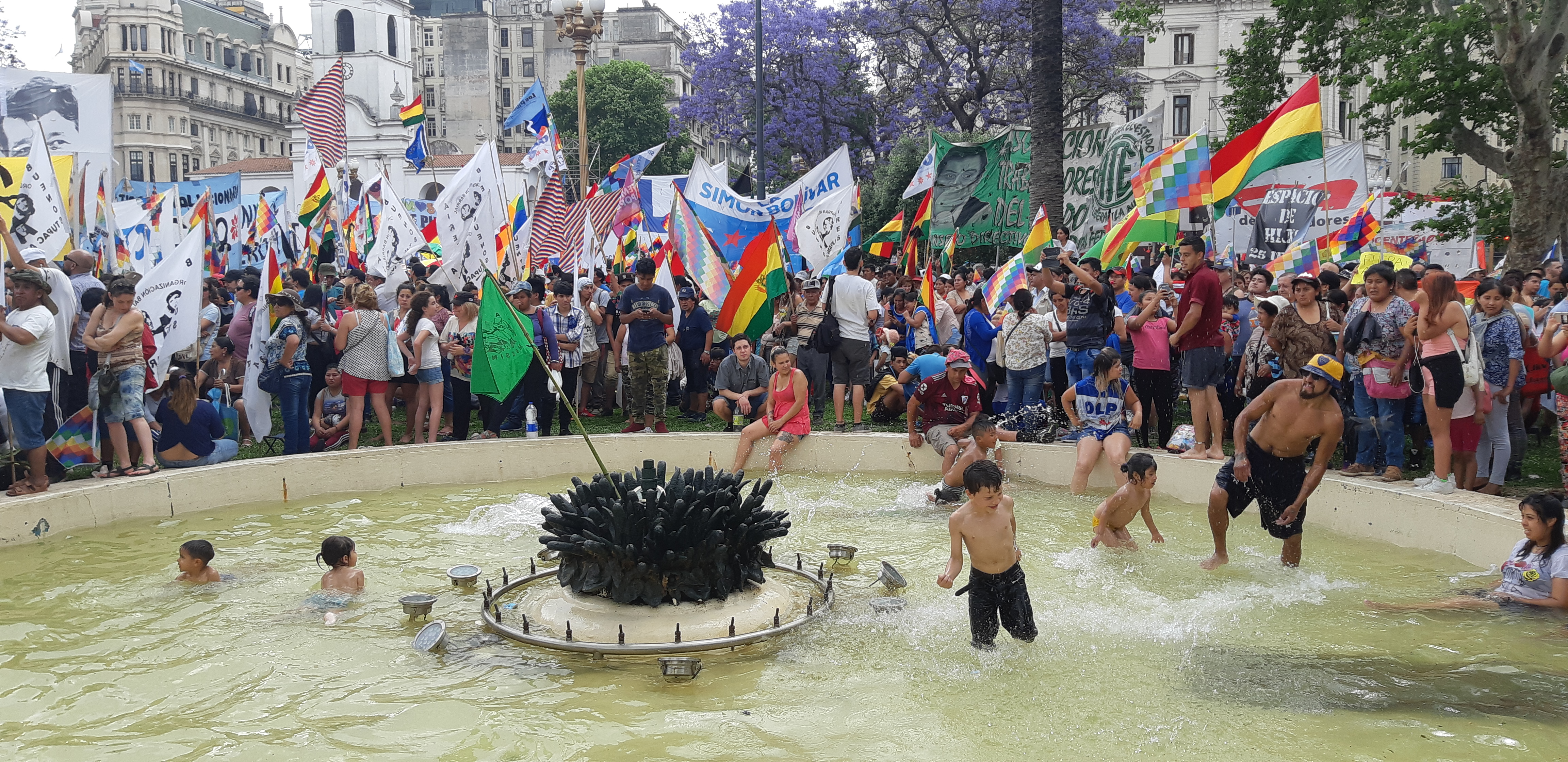 En la fuente de la plaza, revisitan la tradición popular y se bañan los niños. Un conjunto de agrupaciones culturales hacen sonar sikus y bombos. “Mediante nuestra música ancestral nos comunicamos, para ser partícipes no por un partido sino por la hermandad de Bolivia que está sufriendo”, dice Betsy que vive en Buenos Aires en Parque Chacabuco y es originaria de Cochabamba.