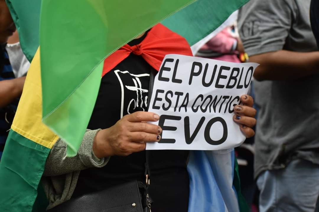Otros carteles dicen “No al golpe de estado”, piden frenar la masacre y paz para Bolivia. Piden por Evo, lo enuncian como el presidente legítimo, le dicen que no está solo y repiten la frase que dejó en el aire antes de salir del país: “Mientras tenga vida seguirá la lucha”.
