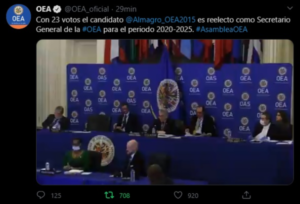 En medio de la crisis y como una promesa de esa intención de dominio estadounidense en la región, el viernes 20 de marzo se ratificó como Secretario General de la Organización de Estados Americanos -OEA- al uruguayo Luis Almagro. La votación representó una diferencia de apoyo respecto de la del 2015, cuando obtuvo su primer mandato al frente del brazo diplomático de dominación de Washington en América Latina.