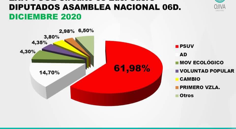 Apenas el 31 por ciento de los 20 millones 700 mil ciudadanos habilitados votó en Venezuela para elegir 277 integrantes de una nueva Asamblea Nacional unicameral, y el 68 por ciento de ellos se inclinó por los candidatos del oficialista Partido Socialista Unido de Venezuela (PSUV)- Polo Patriótico, ratificó Indira Alfonzo, presidenta del Consejo Nacional Electoral.