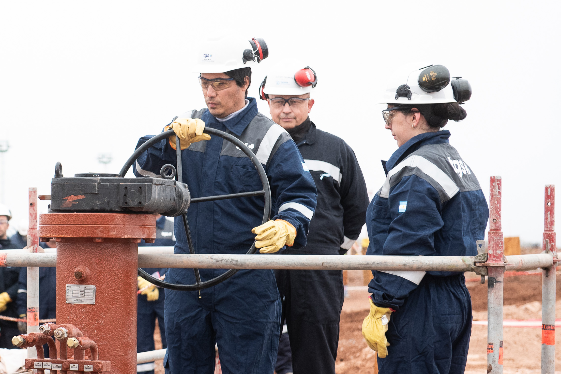 La foto de los tres especialistas encasquetados de la Transportadora Gas del Sur-TGS (Pampa Energía/Grupo Familia Sielecki), encargada de brindar el servicio de operación y mantenimiento del GPNK por un plazo de cinco años, muestra el gesto sencillo de mover el manubrio que dio comienzo a la “puesta en gas” del coloso de 47.700 caños de 12 metros de largo y 36 pulgadas de diámetro (Techint), a lo largo de 573 kilómetros.