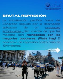 Pero el ajuste no llega por igual en todos lados. ¡Hay plata!, pero no para salarios, ni para educación ni para salud, solo hay cheque en blanco para reprimir. Patricia Bullrich, Ministra de Seguridad de Milei (y del anterior gobierno de Macri) parece ser la única cartera que tiene permiso para gastar a discreción, y lo hace principalmente para reprimir la protesta social. En el marco del tratamiento de la Ley ómnibus en el Congreso de la Nación, se desarrollaron diferentes movilizaciones pacíficas que fueron brutalmente reprimidas y que le ocasionaron al Estado un gasto de 134 millones de pesos y un despliegue de 4 fuerzas federales. Un ajuste de tal magnitud solo cierra con falacias y represión.