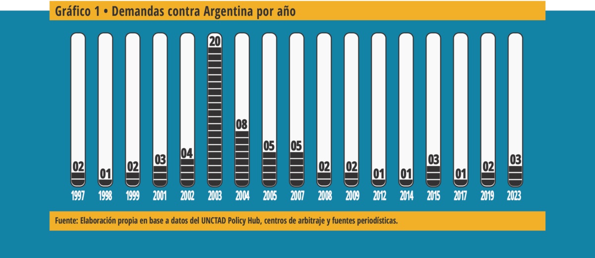 Argentina y Venezuela, los dos países latinoamericanos más demandados, representan casi un tercio de las 415 demandas contra América Latina y el Caribe reconocidas y oficializadas al 1 de julio de 2025. La mayoría de las demandas contra Argentina son fruto del fin de la Ley de Convertibilidad en 2002, que incluyó la devaluación de la moneda, la pesificación, el congelamiento de las tarifas de los servicios públicos y la renegociación de contratos de concesión. Solo entre 2002 y 2007, Argentina fue demandada en 42 ocasiones, con un pico en 2003, con 20 de las 25 demandas contra países latinoamericanos. Este fenómeno dio pie a que numerosos textos académicos se refiriesen a dicha situación como el “caso argentino”.