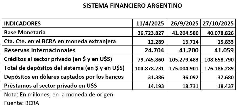 El 11 de abril de 2025 se anunció el acuerdo con el FMI de ampliación del crédito en 20.000 millones de dólares, de los cuales ingresaron cuatro días después 12.000 millones, y en agosto 2.000 millones más. A ello deben sumarse 5.000 millones de dólares de créditos del BID-BIRF y 3.000 millones de dos Repo, que ampliaron la liquidez del sistema, lo que se reflejó en el aumento de depósitos y de préstamos en pesos y en divisas, y las reservas brutas del Banco Central.